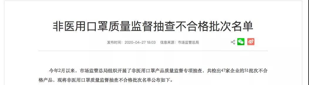 國家市場監(jiān)管總局曝光,51批次口罩被查不合格,涉及47家企業(yè)......